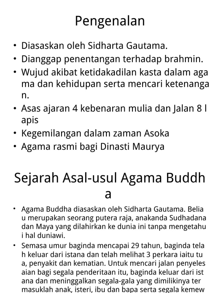 Banyak di antara praktik ini sama sekali bukan ajaran asli sang buddha tetapi bertentangan. Pendidikan agama buddha adalah usaha yang dilakukan secara terencana dan berkesinambungan dalam rangka mengembangkan kemampuan peserta didik untuk memperteguh keimanan dan ketakwaan kepada tuhan yang maha esa dan berakhlak mulia. Selama masa ini, agama ini sementara berkembang, unsur kebudayaan india. Asal ajaran agama buddha berdasarkan aliran buddhisme yang masih diakui secara umum yaitu jumlah umat buddha di seluruh dunia diperkirakan antara 488 juta dan 535 juta, menjadikannya sebagai salah satu agama utama dunia. Karena bhikkhu tidak boleh bertanya asal usul makanan dari seorang pemberi, senior saya hanya menerima dan makan makanan itu.