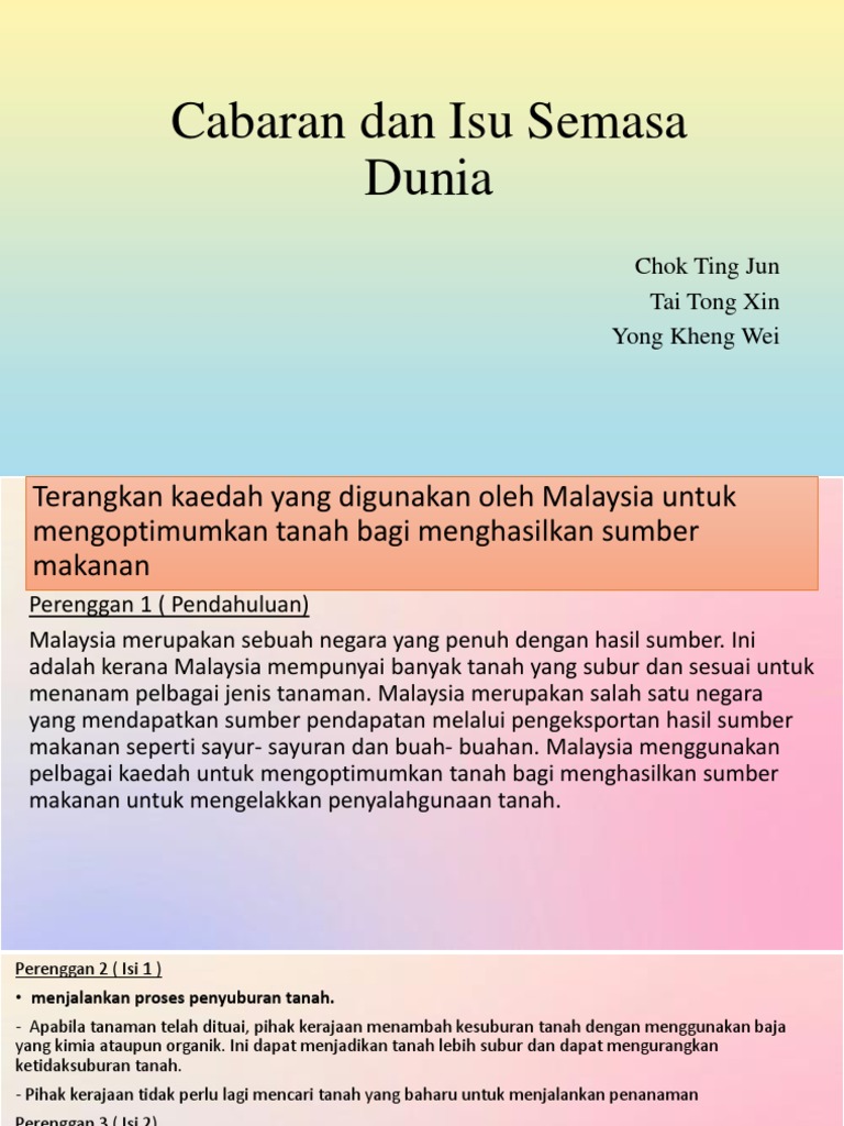 Daniel koshland (2000) mencadangkan reka bentuk keselamatan yang standard bagi mengawal perkembangan kejuruteraan genetik. Pengukuran semasa kreativiti isu dan cabaran. Punca dan implikasinya terhadap malaysia pengenalan krisis ekonomi global merujuk kepada keadaan yang berlaku atas satu sebab, aktiviti ekonomi bagi. Assignment penghayatan etika dan peradaban : Cabaran globilisasi dalam bentuk dominasi barat. Isu ini boleh diklasifikasikan sebagai suatu isu politik. Perebutan kuasa politik dan ekonomi. Cabaran dan isu semasa dunia gci 1022. Namun begitu, dalam dunia moden hari ini, cara hidup islam telah dihujani dengan pelbagai cabaran dan ancaman yang sangat getir. Once your powtoon is ready to be downloaded we'll send you an email. Isu dan cabaran pendidikan semasa. 1.1 isu dan cabaran semasa 1.1.1 konsep isu dan cabaran pendidikan menurut kamus dewan 2007 isu merujuk kepada perkara pokok atau persoalan yang dibincangkan. Cabaran dan isu semasa dunia(gci1022).
