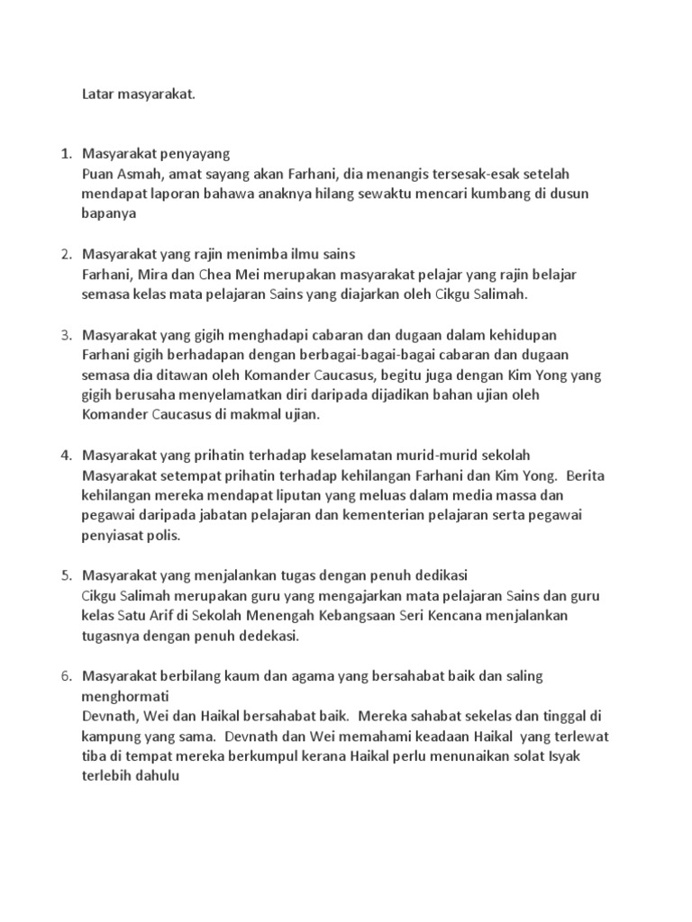 Sinopsis, tema, persoalan, nilai, pengajaran, gaya bahasa, plot, teknik plot, watak dan perwatakan, latar tempat, latar masa, latar masyarakat, soalan + jawapan : Latar tempat, latar masa, latar masyarakat (novel tingkatan 3) latar tempat rumah kim yong. Latarlatar adalah ruang sama ada ruang masa, tempat atau persekitaran iaitu masyarakat yang mendasari sesuatu peristiwa dalam karya prosa. Ini ialah video pengenalan bagi modul yang bertajuk komsas: • komander caucasus telah menawan dan mengurung kim yong di dalam tabung uji balang kaca dalam makmal rahsianya.